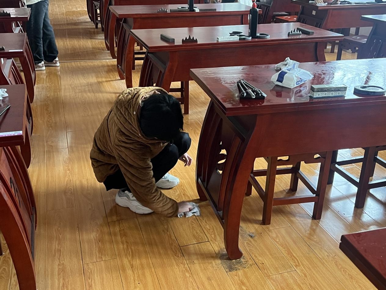 活动当天,30余名员工党员分工协作,对太阳成集团122ccvip书法实训室展开全面清洁,同时将200余份教学资料整理、编号归档。细致清点教材、教具,认真核查资料完整性。大家手持抹布、扫帚等工具,细致擦拭桌椅、清理地面墨迹、整理书法用具,对教学资料进行分类归档。