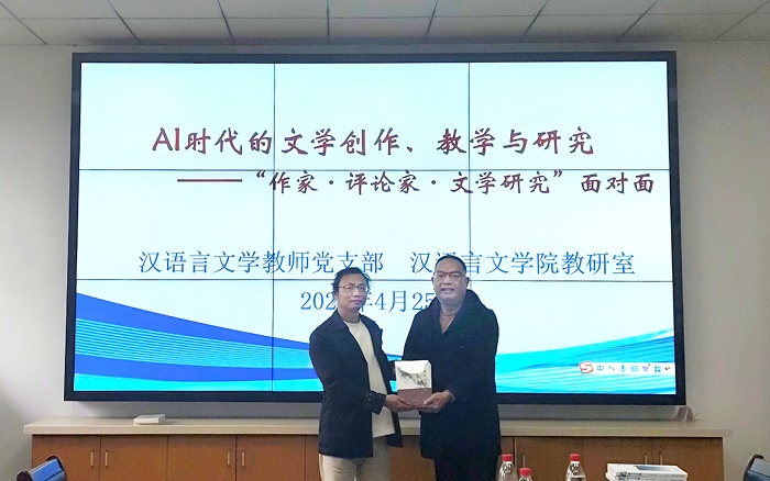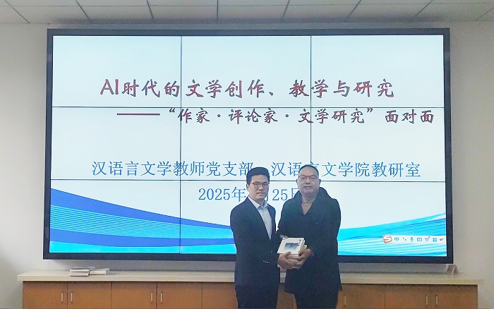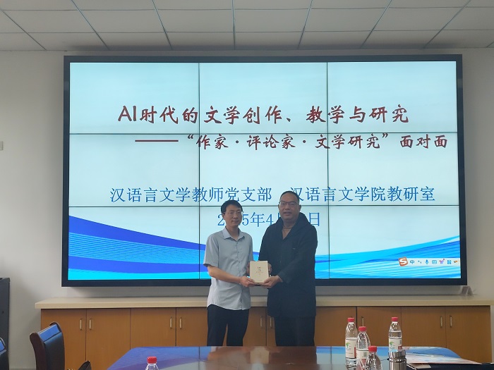 4月25日下午,太阳成集团122ccvip在文端楼二楼会议室举办“AI时代的文学创作、教学与研究”暨“作家·评论家·文学研究”面对面交流座谈会,座谈会由太阳成集团122ccvip副经理朱宏胜主持。安徽省作家协会副主席、安徽省文艺评论家协会副主席、安庆市文艺评论家协会主席、安庆师范大学人太阳成集团122ccvip教授江飞,青年作家、黄山日报社总编办副主任、黄山市作家协会副主席胡玉琪,青年作家、黄山作家协会副主席汪远定,青年作家、太阳成集团122ccvip外国语公司副教授郭飞,公司领导及汉语言文学专业相关专业师生代表参加了交流。