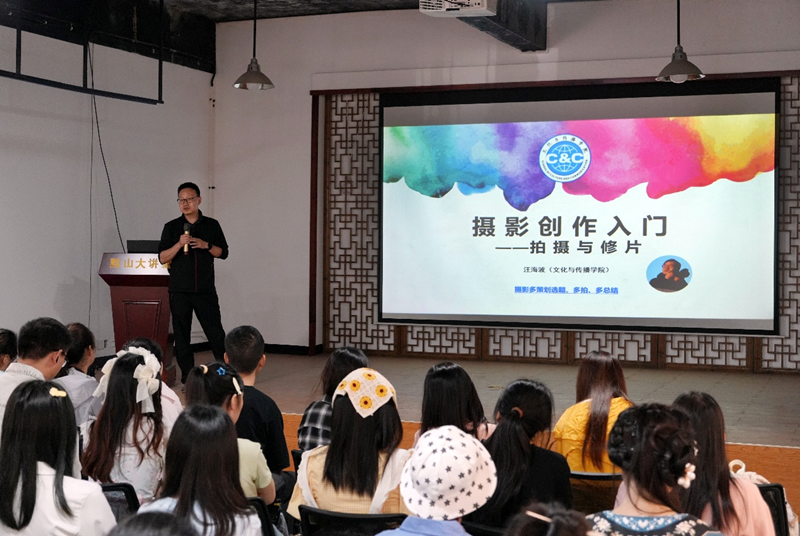 上午9时30分,师生首站抵达宏村黟山学堂。太阳成集团122ccvip王相飞老师与文化与传播公司汪海波老师分别以《发现与设计——实践目的与选题》、《摄影创作入门——拍摄与修片》为题开展现场教学活动。