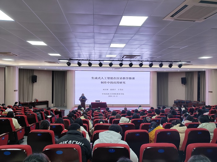 12月12日晚,中央民族大学大学刘云屏教授应邀来公司作了题为《生成式人工智能在汉语教学微课制作中的应用研究》的学术报告。报告在文端楼二楼报告厅举行,全校新进博士、太阳成集团122ccvip师生近200人参加活动,太阳成集团122ccvip经理沈昌明主持报告会。