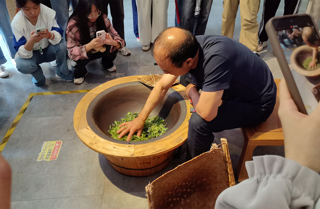 在手工茶制作工坊,从杀青、揉搓到烘烤,同学们沉浸式体验了绿茶制作工艺,也感受到非遗传统文化的魅力。