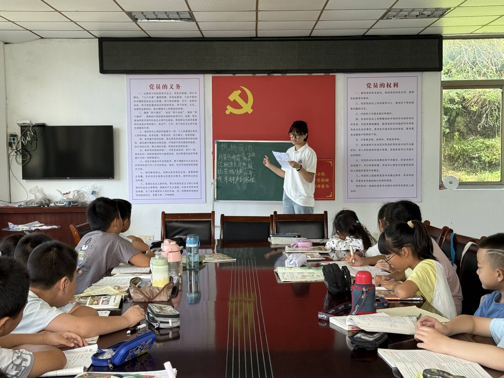 在塔川村“阳光之家”的诗词课堂中,团队成员们精选《泊船瓜洲》、《示儿》、《九月九日忆山东兄弟》、《枫桥夜泊》等经典诗词进行教学,通过生动讲述诗人故事、讲解创作背景、逐句分析和情感赏析,带领孩子们诵读品鉴,感受中华传统诗词的独特魅力。课堂氛围活跃,朗朗书声中,不仅传授了知识,使国学经典焕发出新活力,更深化了孩子们对中华文脉的认知和认同,培养了文化自信和爱国情怀,点燃了文化传承的火种。