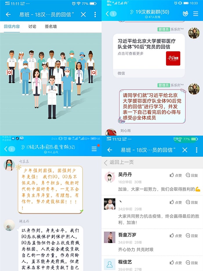 “青年一代有理想、有本领、有担当,国家就有前途,民族就有希望”,总书记的回信温暖亲切、催人奋进,谆谆嘱托,激励着广大青年勇挑重担,极大地鼓舞了同学们的爱国之心,在线上主题讨论中引起热议。该院17汉教班同学们提到,读完习近平总书记的回信,使命感和责任感油然而生。“为奉献者奉献,与逆行者同行。”17中文2班王赞同学说:作为一名青年志愿者,她协助当地村委会为来往车辆人员测量体温,在村中日常巡逻劝导,用实际行动唱响新时代青春之歌。