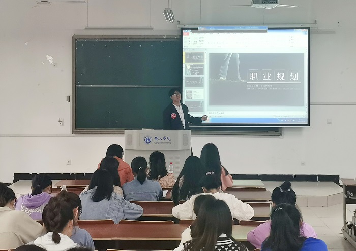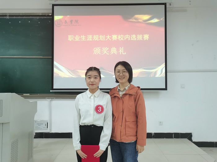 此次比赛共十余人人参加,比赛采用现场PPT陈述的方式进行。选手从个人的人才素质测评报告出发,结合社会需求,从专业、就业、职业等方面进行个人职业生涯规划展示。制定可行计划,确立一个适合自己的未来职业生涯的规划方案。经过激烈角逐,最终18中文唐雨晨同学获一等奖,邓雅静为其颁奖。