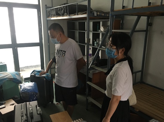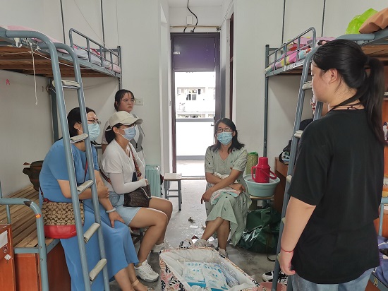新生宿舍中,党员教师为新生答疑解惑,传达公司疫情防护措施,开展防范诈骗的教育宣传。