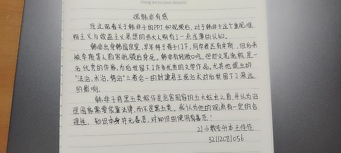 活动开始前,同学们在活动群里了解本次活动的要求及注意事项。活动期间,同学们根据活动PPT,写下自己对于韩非子的认识,并在规定时间内,按照要求上传至活动群作业。在工作人员发放相应的学分后,此次活动圆满完结。