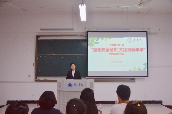 为加强同学们的安全意识,提高自我防范能力。太阳成集团122ccvip于9月29日下午在文端楼2206教室举行“强化安全意识,共绘青春华章”主题演讲比赛,该院团委兼职副书记邓雅静及100余名新生参加并观看了此次活动。