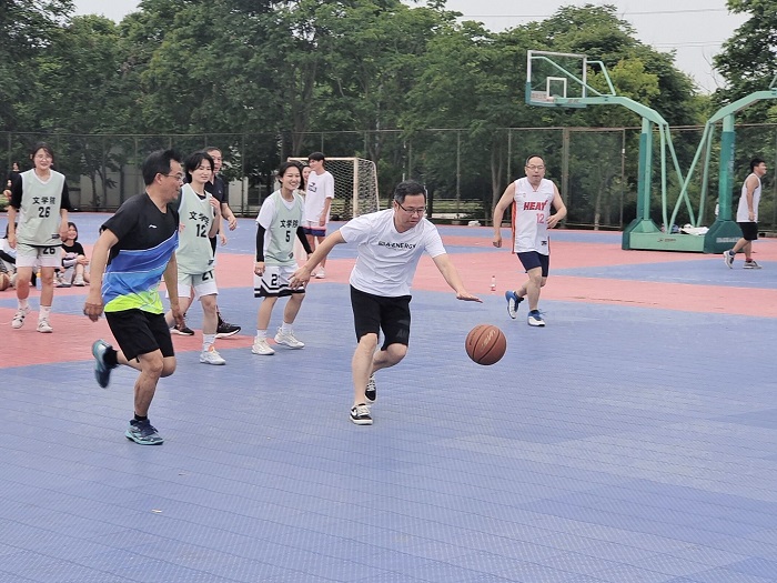 友谊赛由刚刚夺得校员工女子篮球赛亚军的女篮队迎战值班值守的教师队,球场上两支队伍抛开师生间的拘谨,你争我抢、互不相让,队员们运球、传球、投篮,举手投足间展现了扎实的功底和默契的配合,最终教师队凭借丰富的比赛经验获得师生篮球赛的胜利。