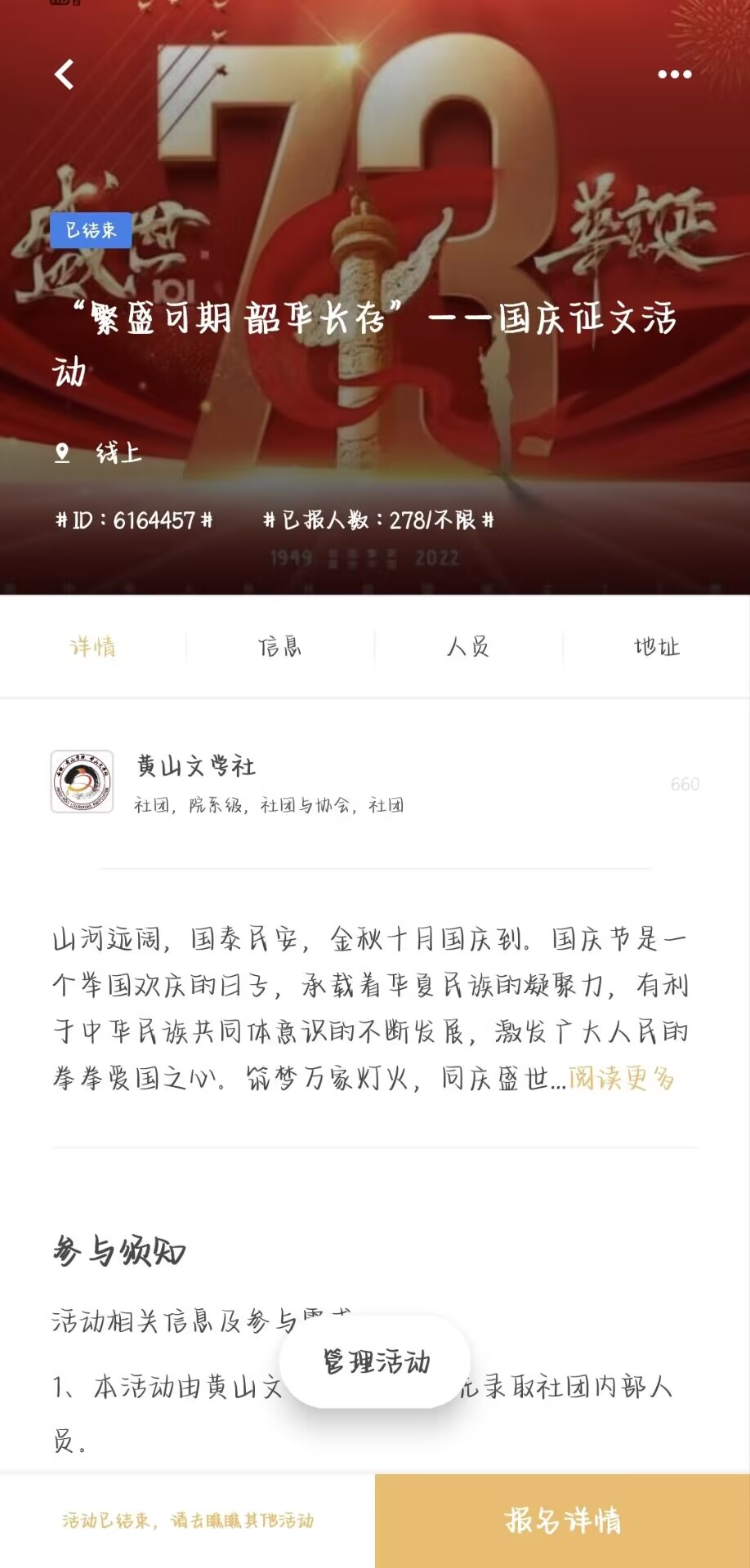 山河远阔,国泰民安,金秋十月国庆到。2022年10月5日,由黄山文学社举办的“繁盛可期 韶华长存”国庆征文活动圆满完结,参与人数约300人。