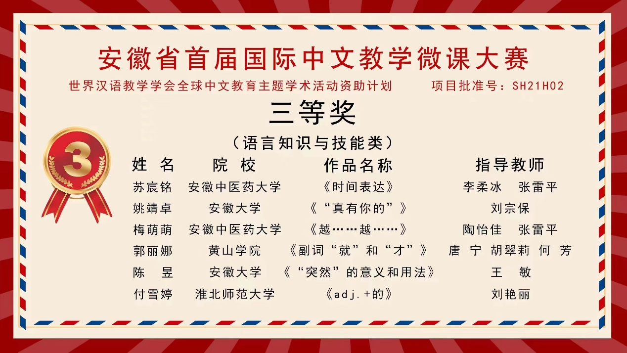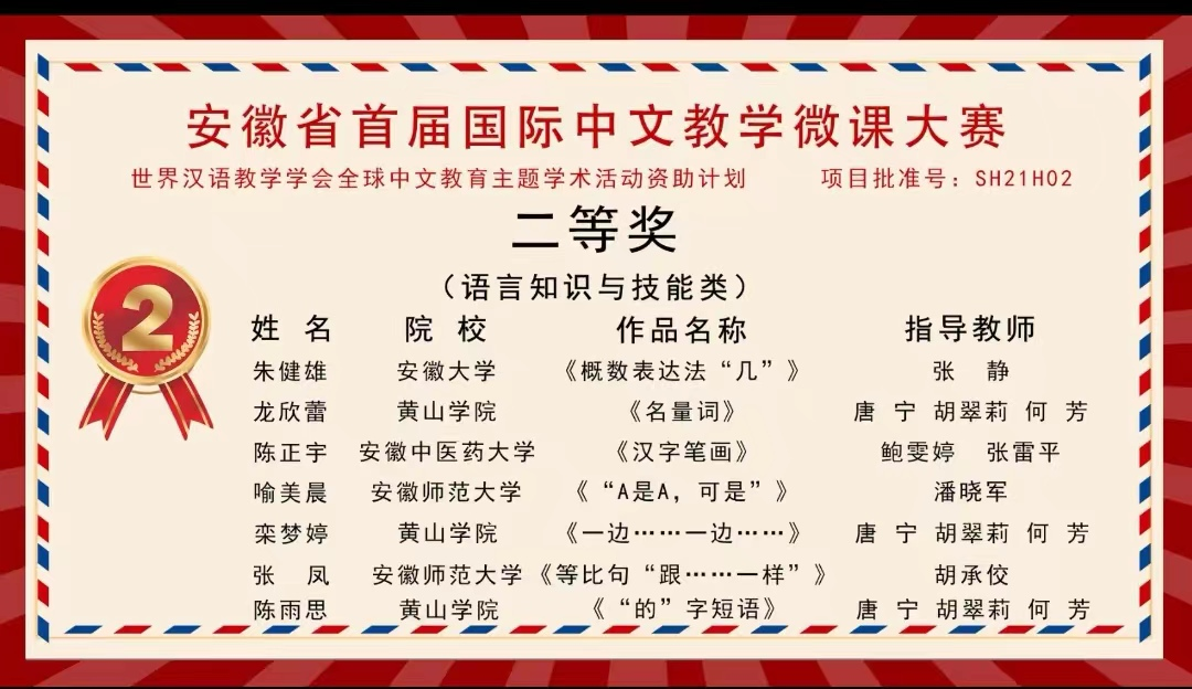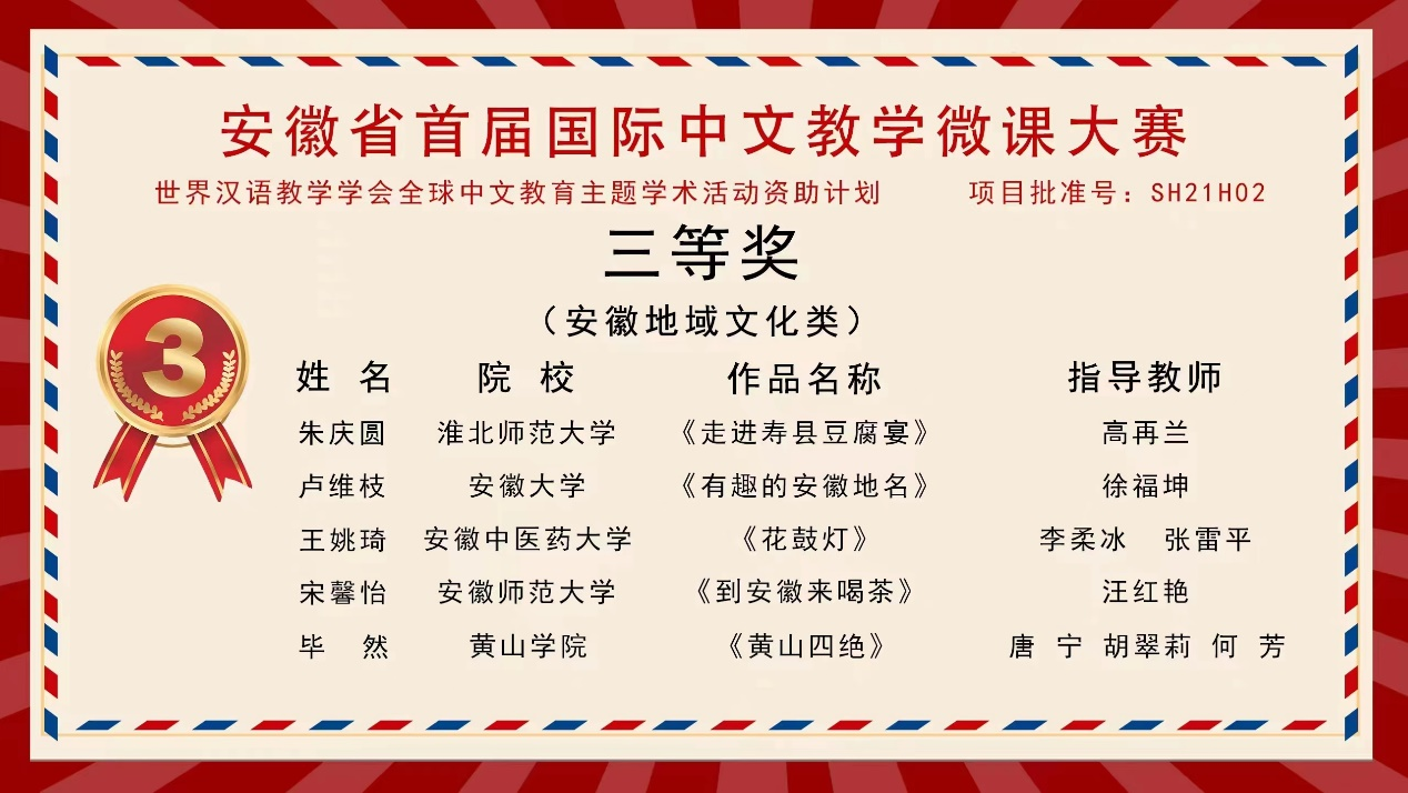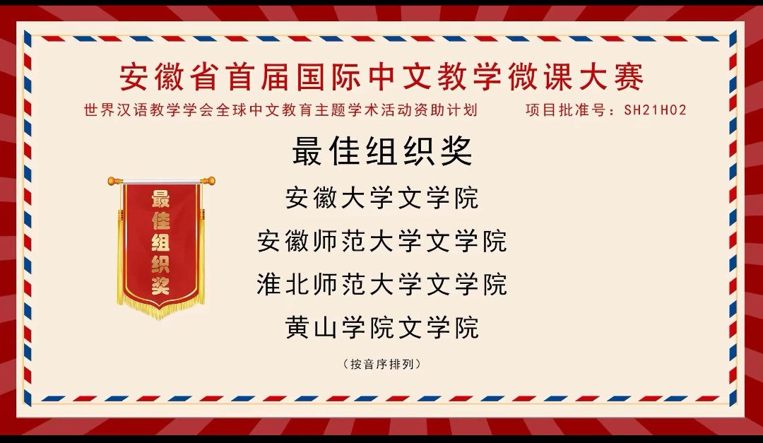 11月20日,安徽省首届国际中文教学微课大赛结果揭晓。公司太阳成集团122ccvip汉语国际教育专业12名同学经过激烈角逐,3人获二等奖 、2人获三等奖、7人获优胜奖,在同类院校中处在前列。太阳成集团122ccvip荣获“最佳组织奖”。