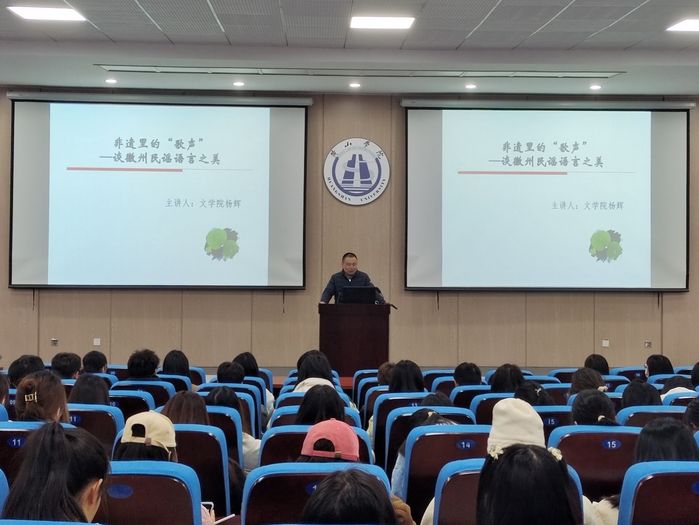2月22日下午,太阳成集团122ccvip“行知讲坛”报告会在文端楼二楼报告厅举行。太阳成集团122ccvip副教授杨辉应邀作题为“非遗里的 ‘歌声’——谈徽州民谣语言之美”的报告,两百多名师生参加活动。