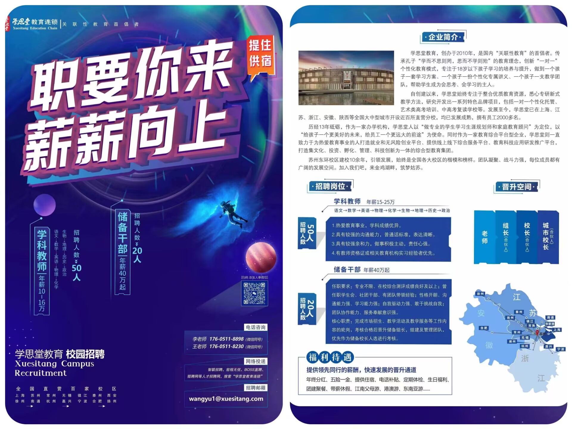 学思堂教育,创办于2010年,是国内“关联性教育”的首倡者。传承孔子“学而不思则罔,思而不学则殆”的教育理念,创新“一对一”个性化教育模式,专注于18岁以下孩子学习的培养与提升,做到一个孩子一套学习方案、一个孩子一份个性化专属讲义、一个孩子一支教学团队,帮助员工成为会思考、会学习的主人。自创建以来,学思堂始终专注于整合优质教育资源,悉心专研新式教学方法,研究开发出一系列特色品牌项目,包括一对一个性化托管、艺术类高考培训、中高考复读公司等。发展至今,学思堂已在上海、江苏、浙江、安徽、陕西等全国大中型城市开设近百所直营分校,均已发展成熟,拥有员工2000多名。历经13年砥砺,作为一家办学机构,学思堂人以“做专业的员工学习生涯规划师和家庭教育顾问”为定位,以“给孩子一个更美好的未来,给员工一个更远大的前途”为使命。同时作为一家教育综合平台型企业,学思堂则一直致力于为热爱教育事业的人打造就业和无风险创业平台、提供线上线下综合服务平台、教育科技应用研发推广平台,打造集文化、投资、孵化、管理、科技创新为一体的综合型教育集团。