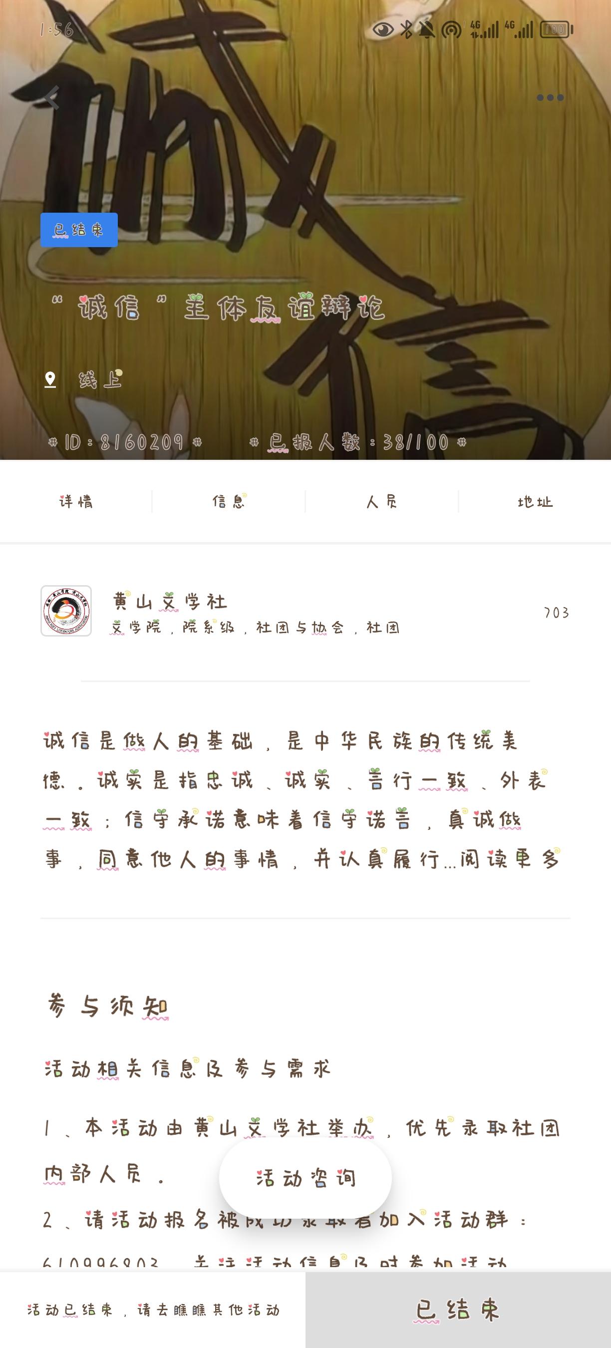 诚信是做人的基础,是中华民族的传统美德。2023年5月31日,由黄山文学社举办的“诚信”主题友谊辩论活动圆满完结,参与人数约100人。