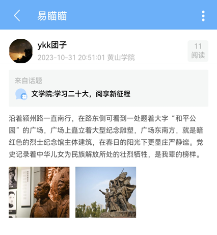 7月1日~7月20日,开展线上学习党的二十大报告活动。员工通过易班课群学习党的二十大报告原文,并以视频的方式分享自己所感所想。此次活动的开展进一步加深了广老员工对党的二十大精神的理解,更好地在未来的学习生活中坚定不移听党话,跟党走,埋头苦干,增强本领,为实现第二个百年奋斗目标奉献青春力量。