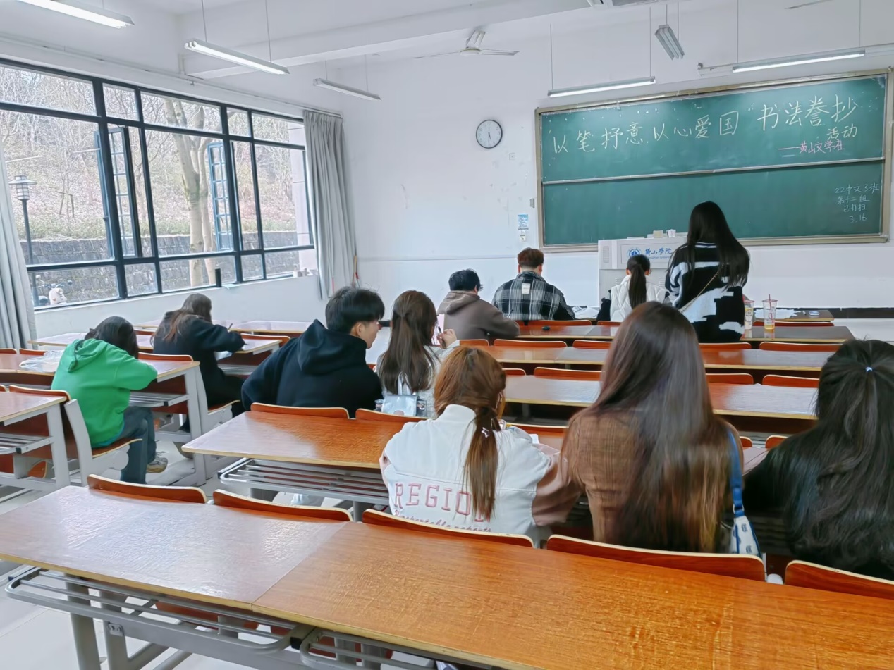 为了丰富同学们的课余生活,更好地了解书法文化、培养爱国情怀并拓宽视野,也有助于构建良好的校园文化氛围。2024年3月16日,由黄山文学社主办,青鸟爱心协会、演讲与辩论协会、徽州学社、汉文化阁协办的“以笔抒意,以心爱国”书法誊抄活动圆满完结,参与人数约150人。