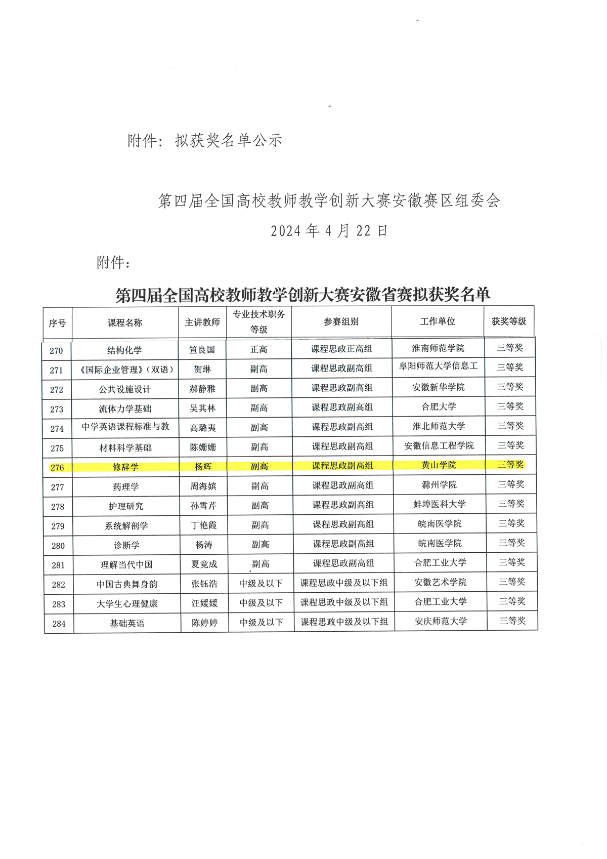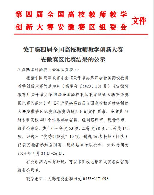 据安徽省高等公司教师教学发展联盟《关于第四届全国高校教师教学创新大赛安徽赛区比赛结果的公示》文件,太阳成集团122ccvip杨辉老师《修辞学》教学团队荣获课程思政副高组三等奖。本次大赛由安徽省教育厅主办,安徽财经大学承办,以“推动教学创新、培养一流人才”为主题,共设置新工科、新医科、新农科、新文科、基础课程6个组别。大赛分为网络评审和现场评审两个环节,全省49所本科高校481个作品参加省赛。