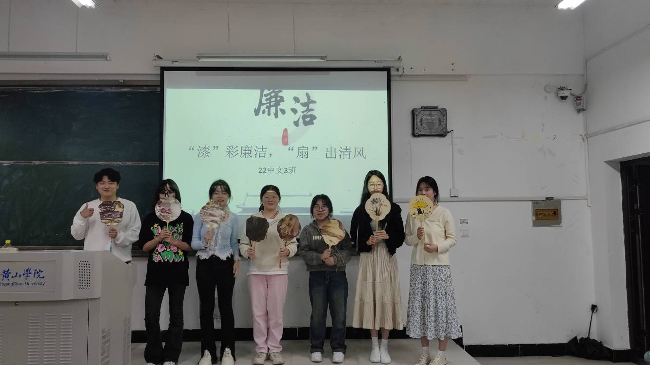4月25日下午,22中文3班在责任教室开展“‘漆’彩廉洁,‘扇’出清风”非遗漆扇活动。