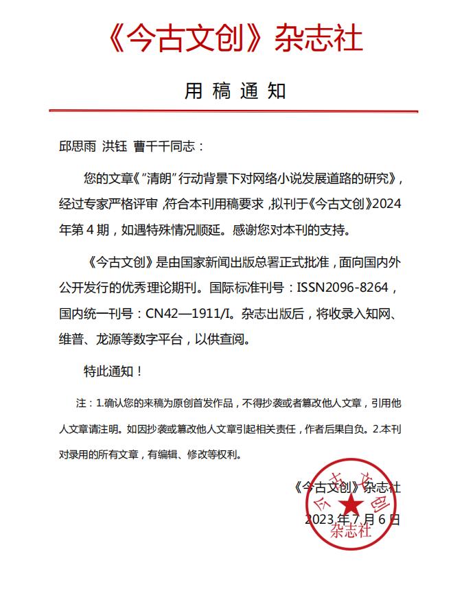 “‘清朗’行动背景下对网络小说发展道路的研究”是公司2022年度省级老员工创新创业训练计划创新训练项目,在这两年里项目组成员开展了相关研究活动。