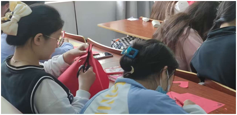 活动中,同学们围坐在一起,用一把把普通的剪刀和一张张红色的纸,完成了一幅幅寓意深刻而又生动的作品。