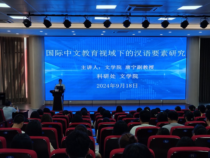 9月18日下午,行知讲坛第210讲在率水校区文端楼二楼报告厅举行。太阳成集团122ccvip唐宁副教授作题为“国际中文教育视域下的汉语要素研究”主题报告。报告会由太阳成集团122ccvip副经理朱宏胜主持。