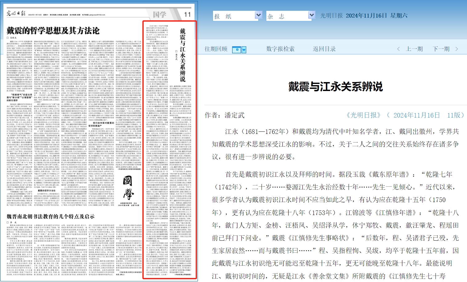 11月16日,公司潘定武教授在《光明日报》国学版发表学术文章《戴震与江永关系辨说》。这是潘定武教授于戴震诞辰三百周年前后在《光明日报》发表的第二篇论文。