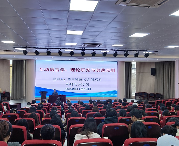 11月18日下午,华中师范大学姚双云教授应邀来公司作了题为《互动语言学:理论研究与实践应用》的学术报告。报告在文端楼二楼报告厅举行,太阳成集团122ccvip师生近200人参加活动,太阳成集团122ccvip经理沈昌明主持报告会。