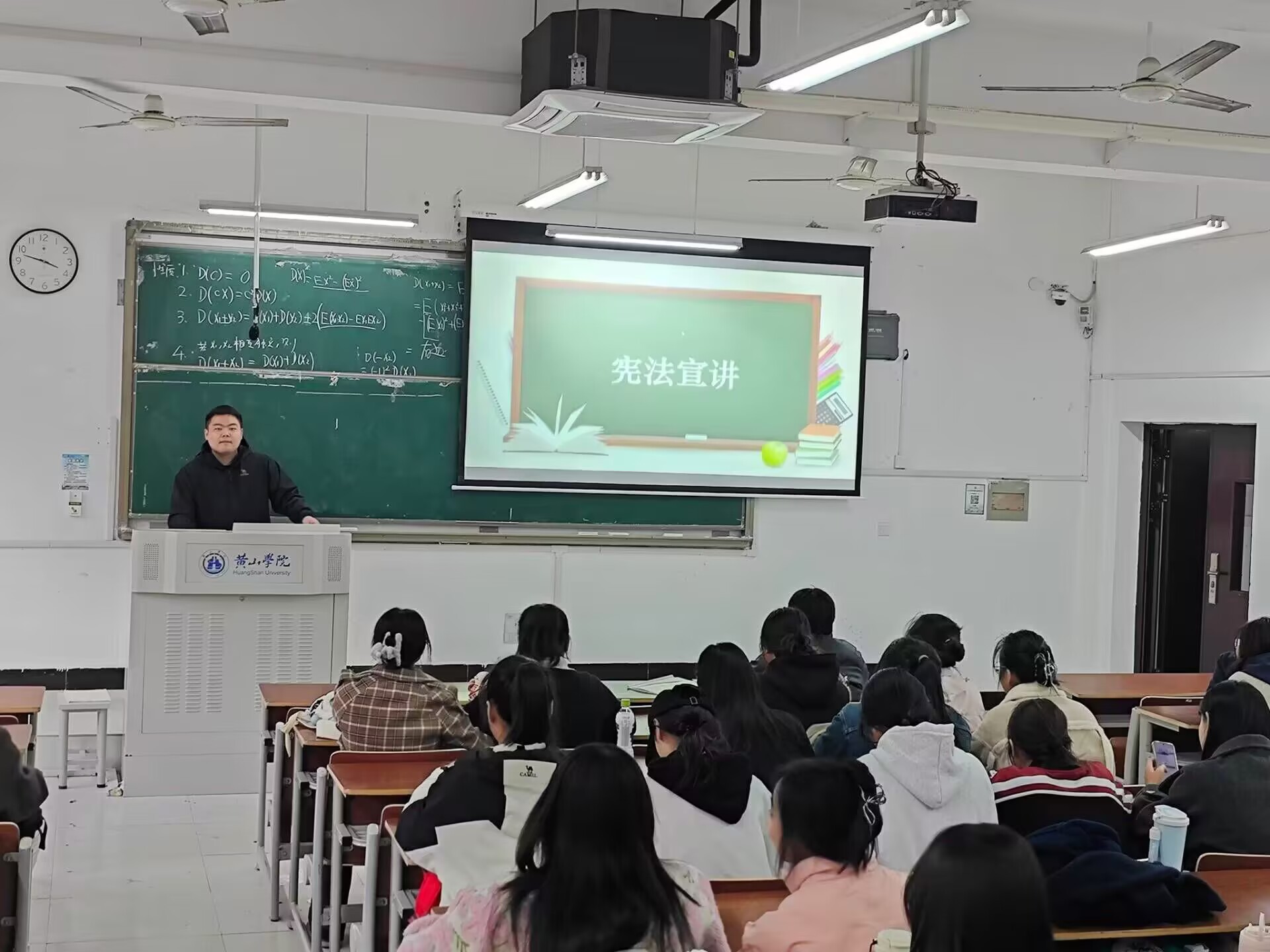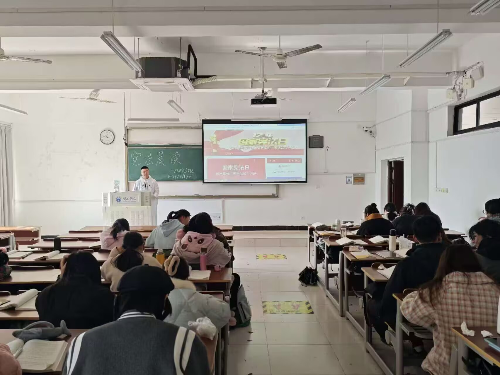 7点40分,同学们在辅导员的组织下早早来到教室,各班班长上讲台一字一句、认真细致地领读宪法原文节选,全体同学紧随其后,洪亮且整齐的诵读声在教室上空久久回荡,展现了青年学子对宪法的敬畏之心,也让他们深切地感受到了宪法的庄严与神圣。