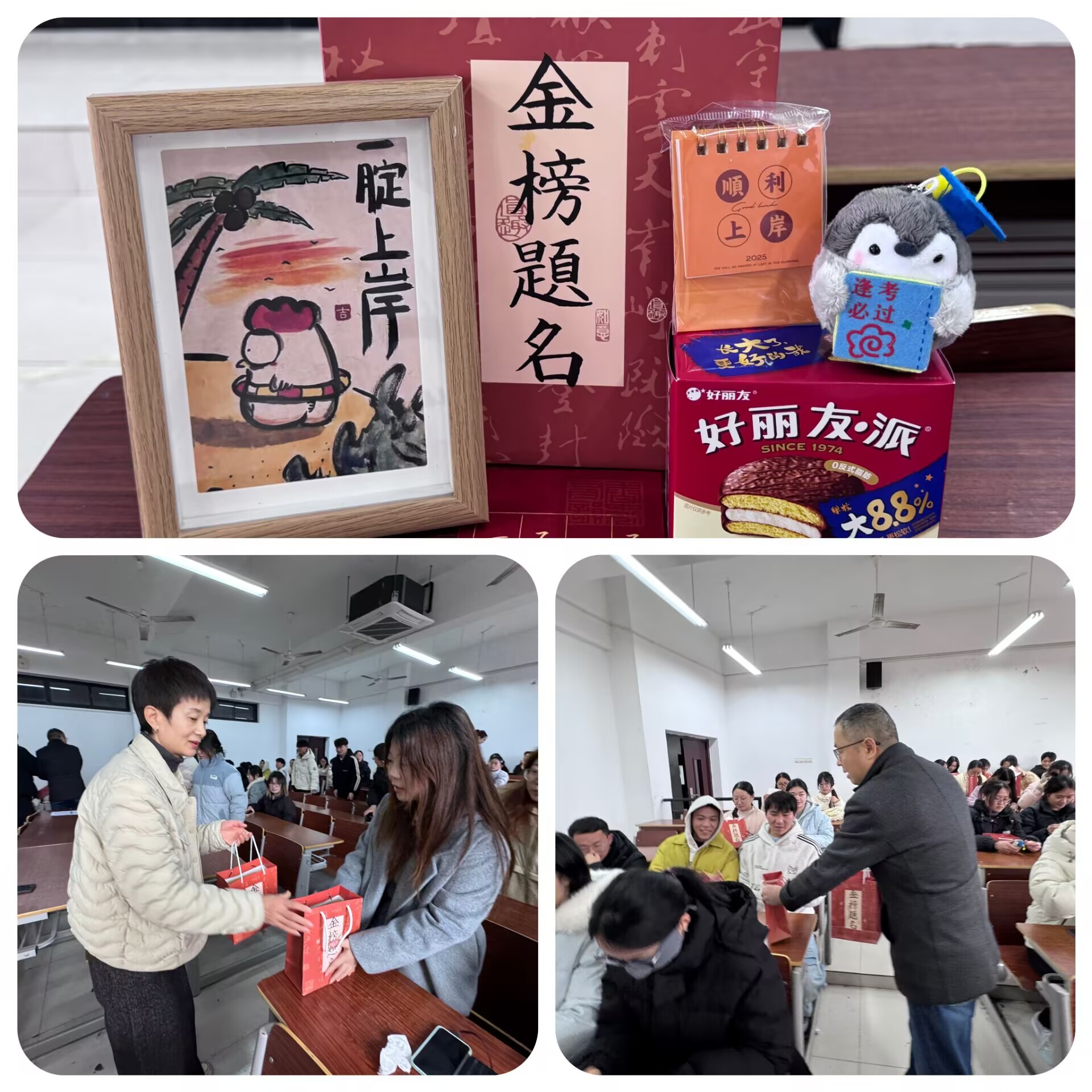 周志荣在动员讲话中充分肯定了同学们为考研付出的努力,鼓励大家坚持梦想、勤学不殆,保持良好的学习状态,全力冲刺,一举成功。朱宏胜为同学们在最后冲刺阶段和考试过程中提出诸多宝贵建议和答题技巧,希望同学们保持自信心、以平和的心态完成考试,同时做到诚信考试。最后,领导和辅导员老师一起为考研学子赠送公司精心准备的礼品,饱含着公司对考研学子的深深祝福和殷切关怀。