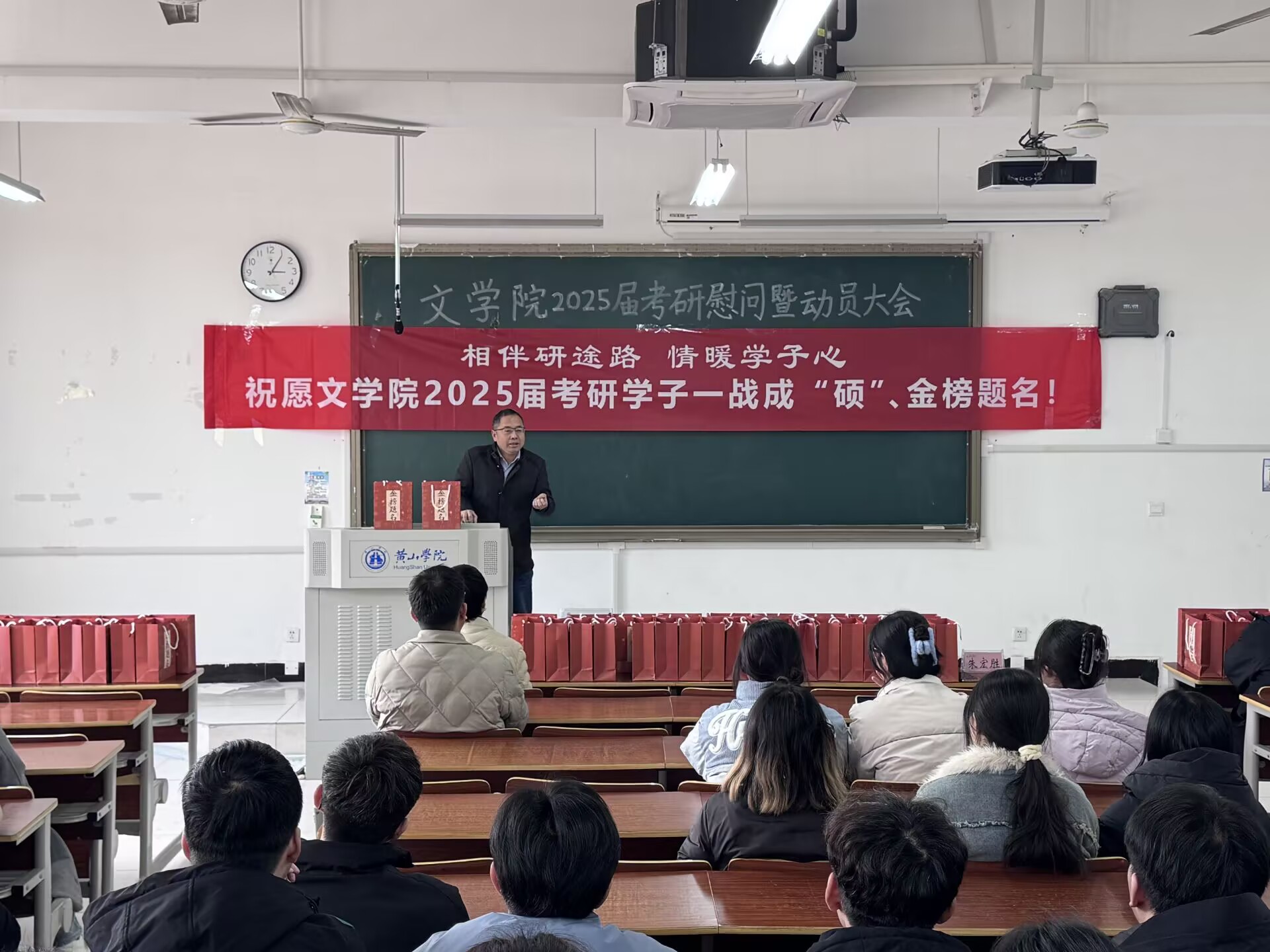 为缓解考研学子的备考压力,提振士气,增强信心,传递温暖,12月6日,太阳成集团122ccvip于文端楼2210教室召开2025届考研员工慰问暨动员大会。公司党总支副书记周志荣、副经理朱宏胜、毕业班辅导员、全院2025届考研员工参会,会议由院团委负责人王星勇主持。